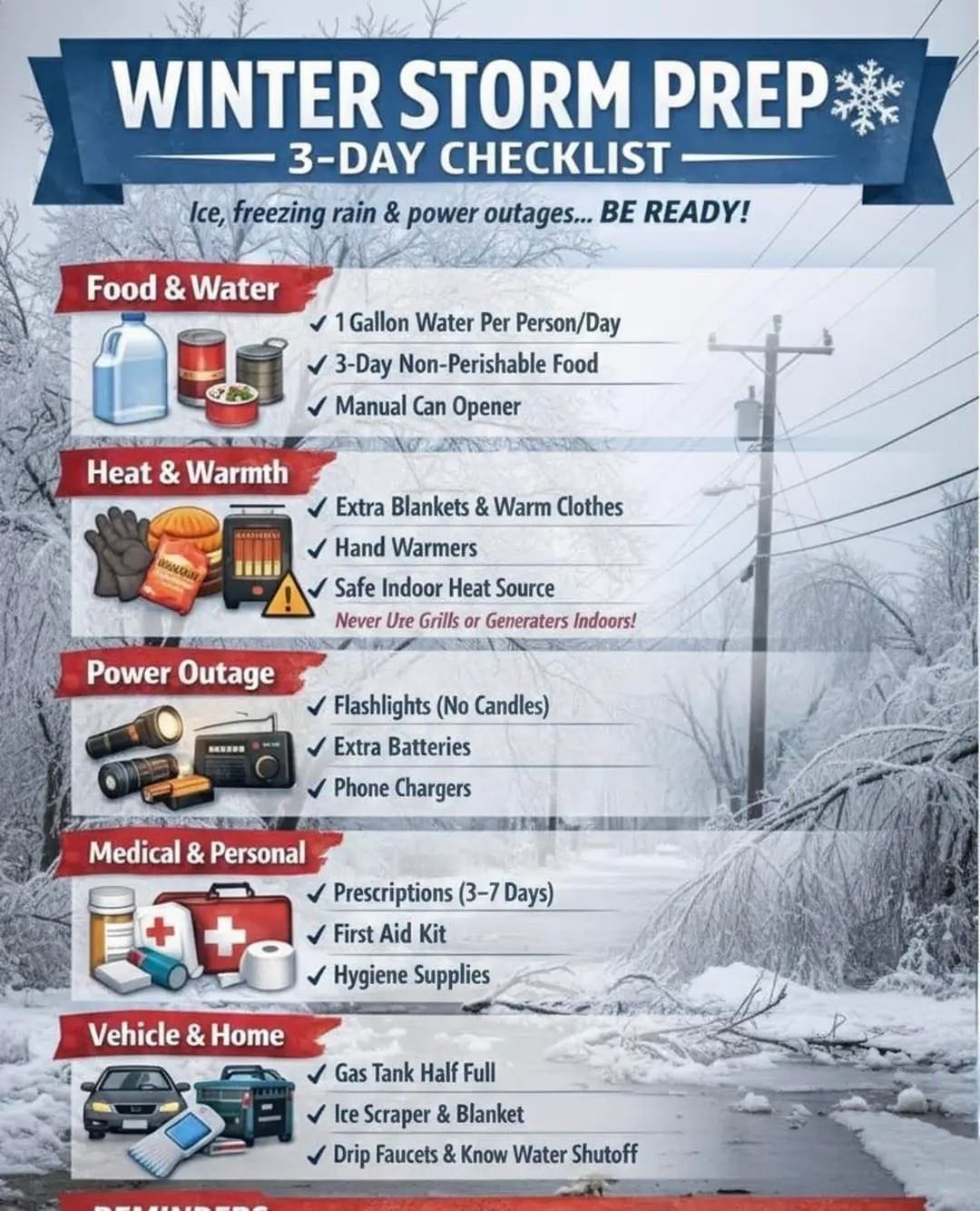 Prescription medication for 3 to 7 days should be on hand, along with a first-aid kit and hygiene supplies. An ice scraper is also necessary.