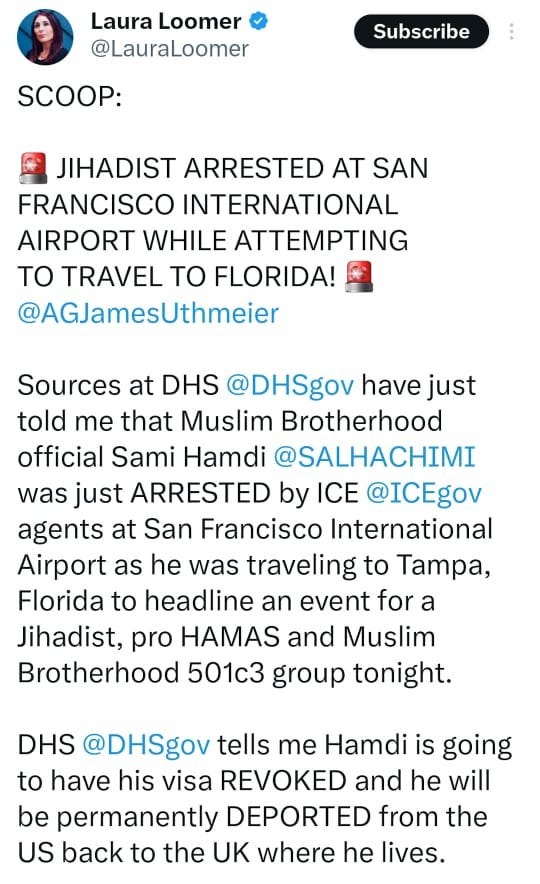 According to Press TV, Loomer wrote online, “You are lucky his only fate is being arrested and deported,” while labeling Hamdi “a supporter of Hamas and the Muslim Brotherhood”. The DHS official announcement cited a report from RAIR Foundation, an organization the Southern Poverty Law Center has previously characterized as an anti-Muslim hate group.