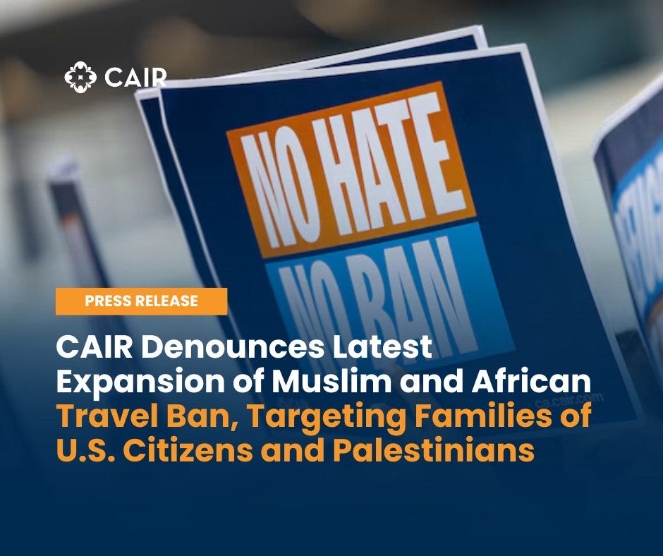 CAIR regional chapters in California, New Jersey, Washington state, and Chicago have issued similar condemnations of the broader 2025 travel and immigration regime, calling the policies discriminatory and harmful to Muslim and African communities. CAIR-SFBA and CAIR-LA previously said Trump’s renewed and expanded bans “revive” and “repackage” versions of the original 2017 “Muslim ban” that survived limited Supreme Court review, warning that the new orders will again block refugees, students, and families under the “guise of national security”. CAIR-Washington and CAIR-Chicago have also noted that expanded vetting, suspensions of visa processing, and added ideological screening create “renewed fear and uncertainty” for refugees and immigrants from affected countries, while promising legal support and advocacy for those impacted.