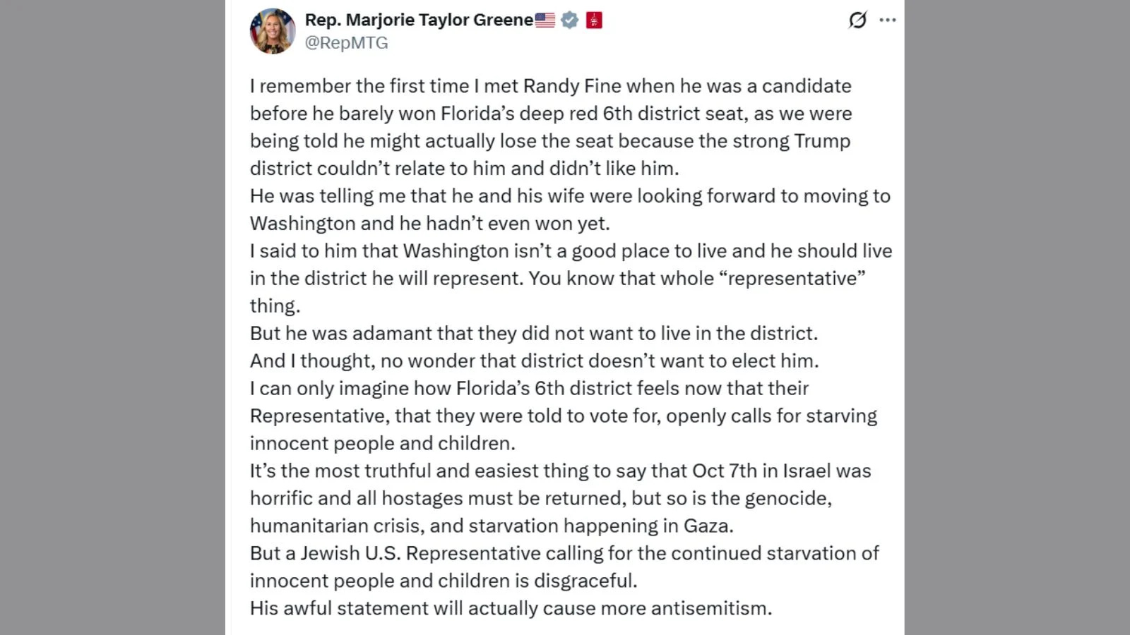 Greene’s condemnation also took aim at her Republican colleague, Representative Randy Fine of Florida, who recently faced backlash for social media posts downplaying suffering in Gaza. Greene criticized Fine’s contention that images of starving Palestinian children were “Muslim terror propaganda,” challenging fellow Republicans to confront the mounting civilian toll.