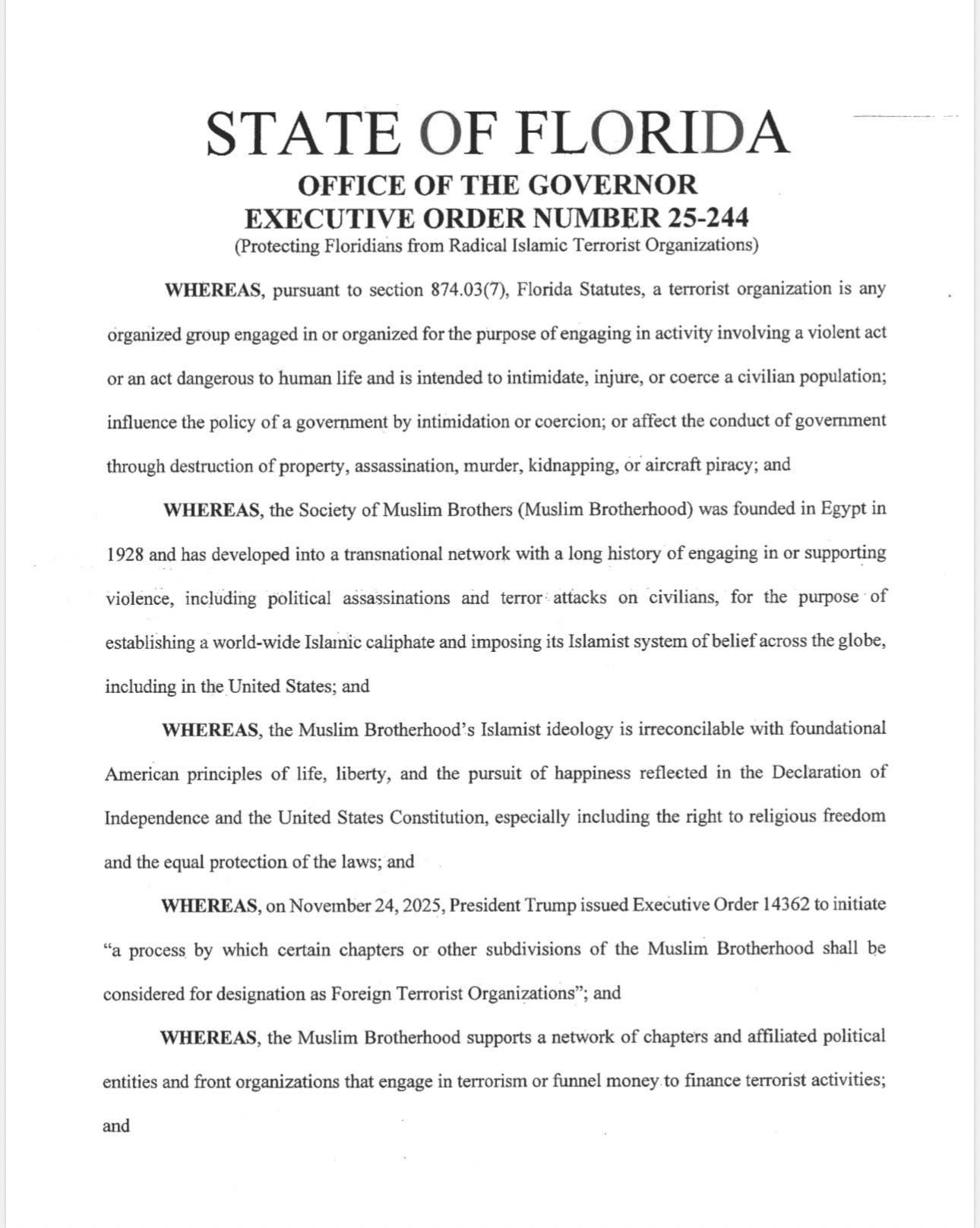 Florida Governor Ron DeSantis designated the Council on American-Islamic Relations (CAIR) and the Muslim Brotherhood as foreign terrorist organizations through an executive order issued Monday, prompting the nation’s largest Muslim civil rights group to immediately announce legal action against what it termed an “unconstitutional” and “defamatory” proclamation, according to ABC News. The move comes less than a month after Texas Governor Greg Abbott issued a similar declaration, setting up what legal experts predict will be protracted court battles over state versus federal authority in terrorism designations, according to WUSF.