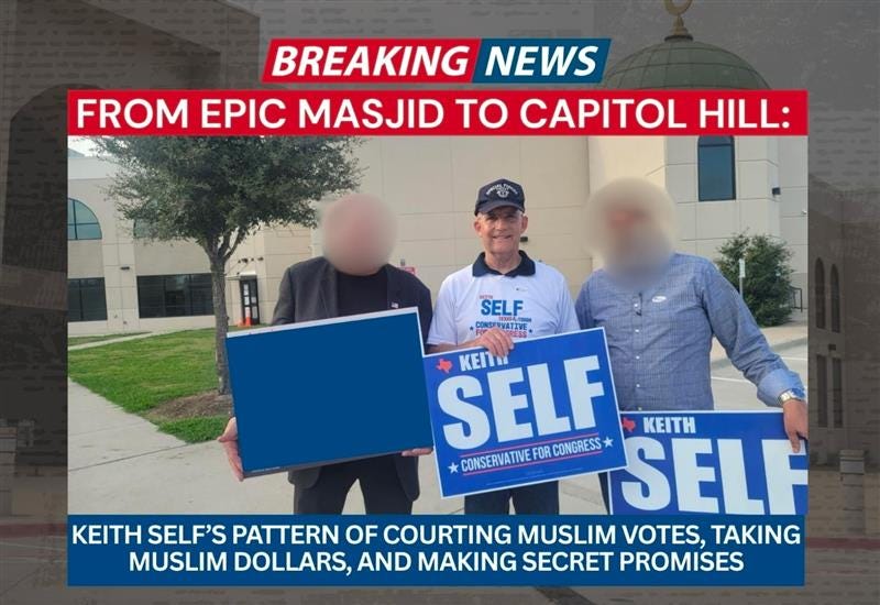 During his 2022 campaign, Self aggressively courted Texas Muslims. Multiple accounts confirm he campaigned at the East Plano Islamic Center (EPIC), attended Muslim community events, visited Muslim homes, raised campaign funds from Muslim donors, and made assurances behind closed doors. These were not one-off meetings, but a sustained strategy to secure votes, money, and legitimacy.