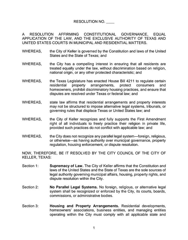 The adopted resolution, titled “A Resolution Affirming Constitutional Governance, Equal Application of the Law, and the Exclusive Authority of Texas and United States Courts in Municipal and Residential Matters,” declares that the City of Keller “is governed by the Constitution and laws of the United States and the State of Texas” and that these are “the sole sources of legal authority” over municipal affairs, housing, property rights and dispute resolution.
