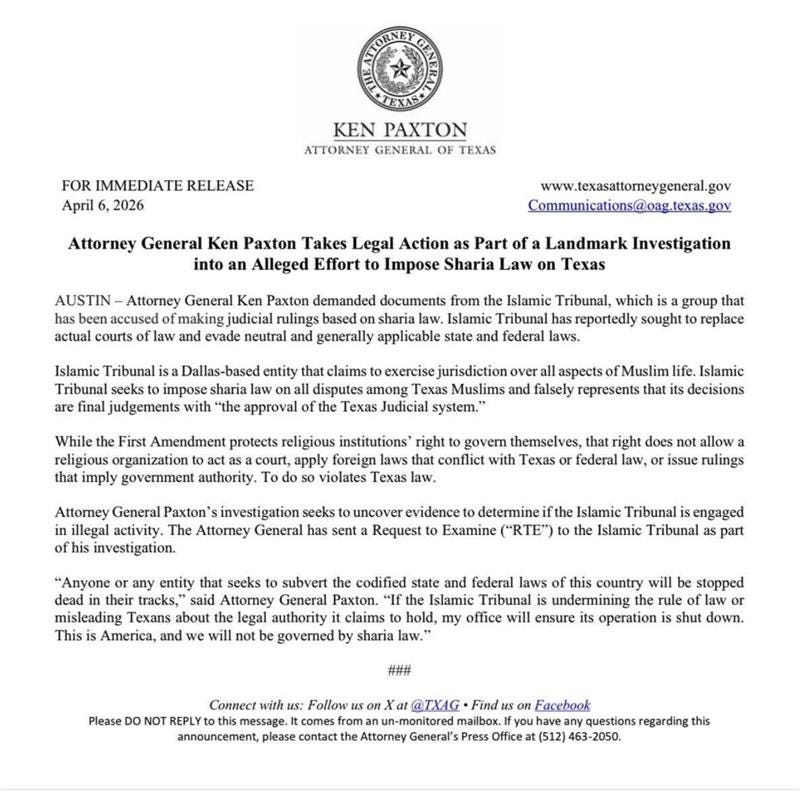 Texas Attorney General Ken Paxton said Monday that his office is demanding documents from the Dallas-based Islamic Tribunal, alleging the group may be unlawfully acting as a court and imposing “sharia law.”