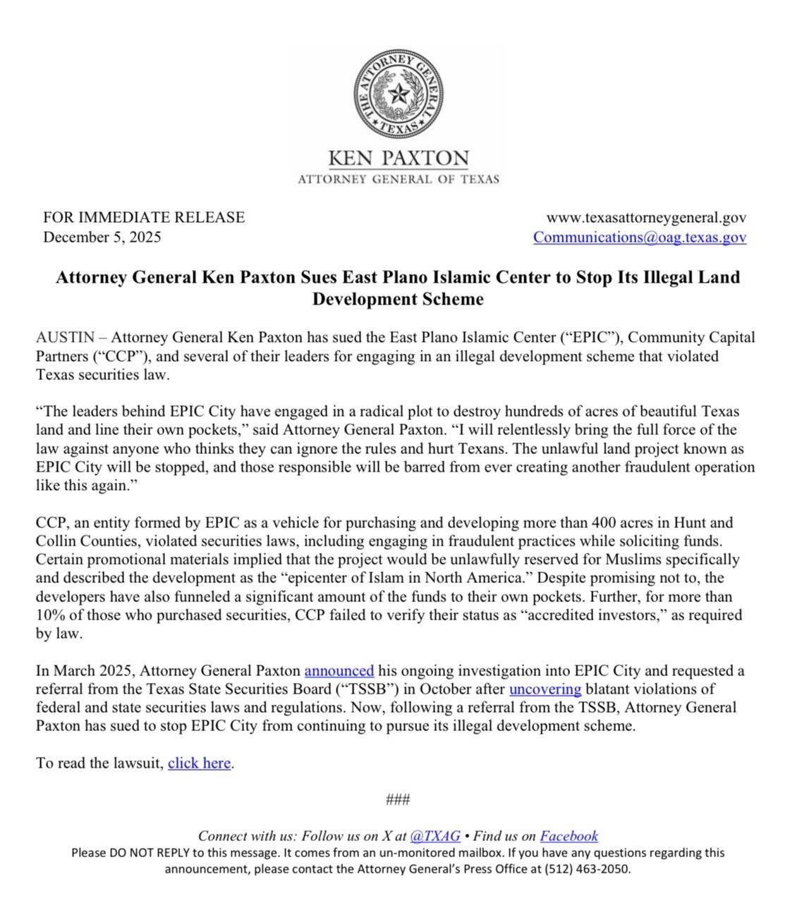 Texas Attorney General Ken Paxton has filed a lawsuit in Collin County against the East Plano Islamic Center (EPIC), its investment vehicle Community Capital Partners, and several leaders, accusing them of running an illegal securities and land development scheme tied to a 400‑plus‑acre housing project once branded “EPIC City” and now known as “The Meadow.” The suit, filed December 4, follows a months‑long investigation and a referral from the Texas State Securities Board and seeks to halt fundraising, freeze assets, and unwind investments in the master‑planned Muslim‑centered community proposed in unincorporated Collin and Hunt counties, northeast of Dallas. Paxton announced the move in a social media statement calling the project an “unlawful land project” and the financing model a “radical plot to destroy hundreds of acres of beautiful Texas land and line their own pockets.”