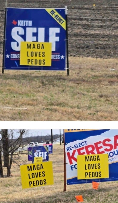 A series of yellow signs reading “MAGA Loves Pedos” have appeared in front of Republican campaign displays across Collin County, igniting a fierce legal and political dispute.